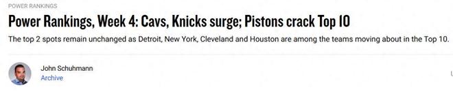 4-10名(括号内为上期排名):尼克斯(7)、骑士(8)、湖人(3)、马刺(9)、活塞(12)、雄鹿(5)、森林狼(10)