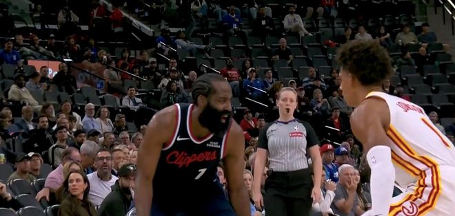 到了最后一节,老鹰加强对哈登的防守,哈登上演无解的三分三连击,快船才将比分追平,主场观众彻底膜拜。之后,登哥又面对两人起跳,轻舒猿臂抛投得分。