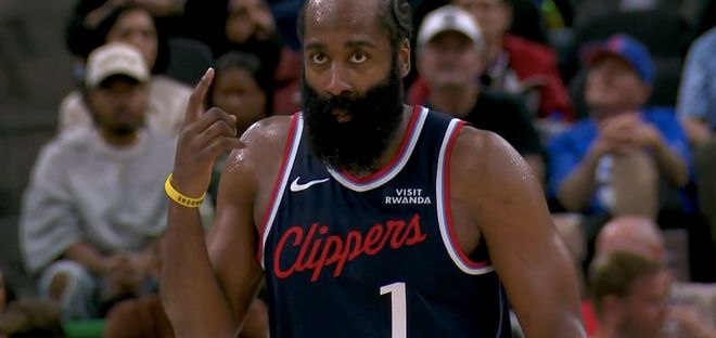 哈登的两个进球都相当精彩,右侧单挑克雷伊奇,突破的过程中高难度跳投得分,点燃替补席。
